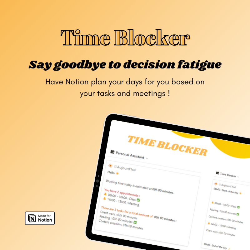 Are you tired of feeling overwhelmed by your daily tasks? Struggling with decision fatigue? Introducing the Time Blocker Notion template - your hands- on companion to a more organized, productive day. This template is designed to bring structure to your chaos and streamline your tasks and meetings, making time management a breeze 🌬️.