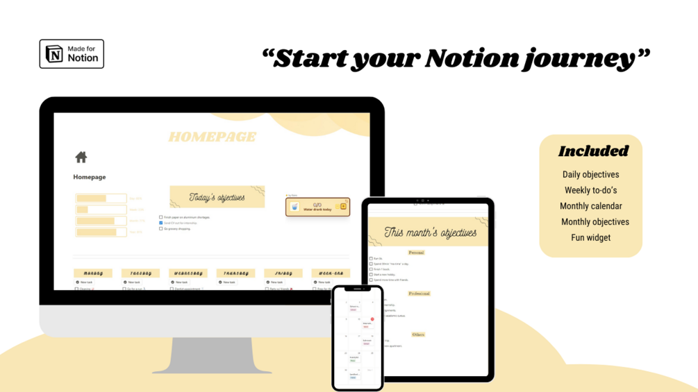 You'll get the "My first notion page" : daily objectives, weekly to-do's, monthly calendar, monthly objectives.
